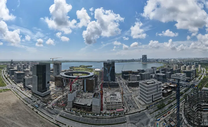 空中俯瞰临港新片区滴水湖金融湾,左为建设中的滴水湖金融湾标志性建筑“荣耀之环”。图片来源:新华每日电讯