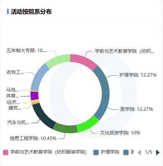 各院系发布的活动数量占比,数量较多的学院依次有汽车与机电工程学院、农牧工程学院和学前与艺术教育学院。
