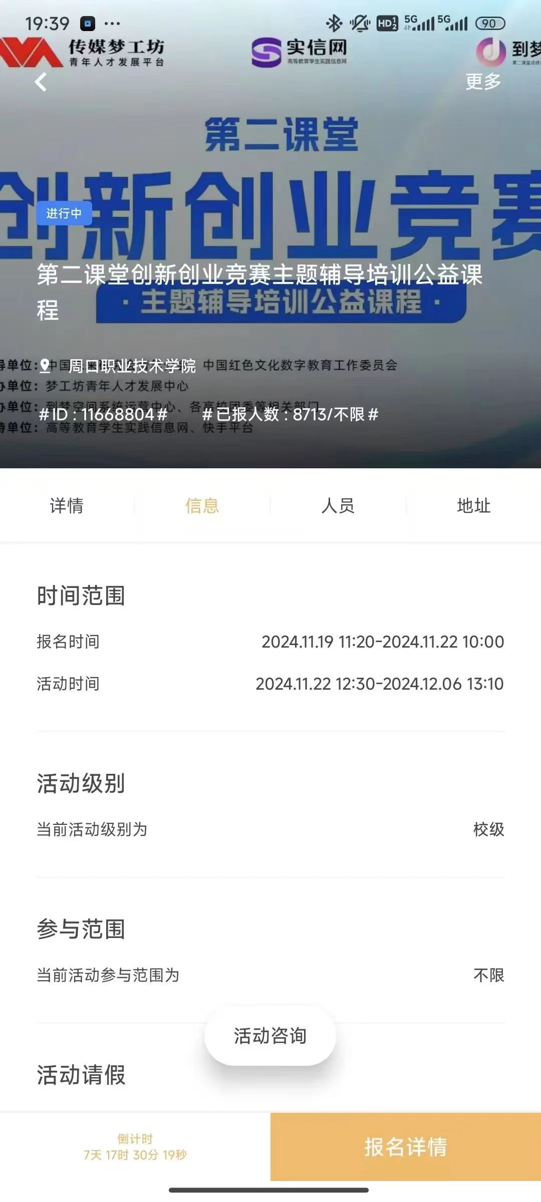 第二课堂创新创业竞赛主题辅导培训公益课程活动在本周基本完善,报名人数较多,几乎全校参与,本校名次靠前。