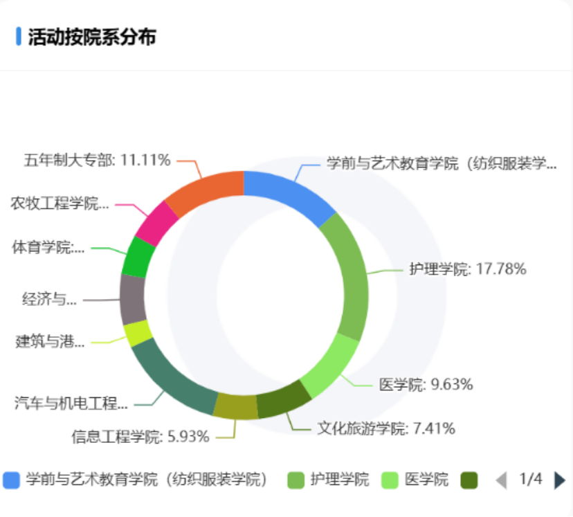 各院系发布的活动数量占比,数量较多的学院依次有护理学院、汽车与机电工程学院和学前与艺术教育学院。
