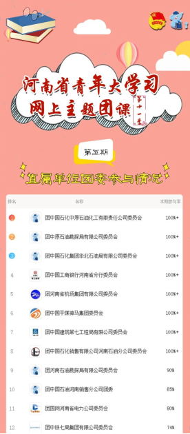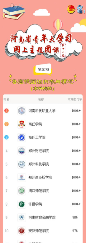上周“青年大学习”网上主题团课中,本科院校类别中河南科技职业大学、商丘学院、商丘工学院、郑州财经学院、郑州科技学院、郑州西亚斯学院、周口师范学院、许昌学院参与率为100%+,河南农业大学、黄河交通学院、郑州大学、河南牧业经济学院、铁道警察学院上周参与率低于70%,继续加油;高职高专院校类别中第一拖拉机制造厂拖拉机学院、鹤壁能源化工职业学院、河南地矿职业学院、许昌电气职业学院、南阳职业学院、三门峡社会管理职业学院、河南物流职业学院、驻马店职业技术学院、郑州商贸旅游职业学院、济源职业技术学院参学率榜前领跑,焦作工贸职业学院、南阳科技职业学院、郑州电子商务职业学院、郑州工业安全职业学院、濮阳石油化工职业技术学院、汝州职业技术学院、林州建筑职业技术学院、河南女子职业学院上周参与率低于10%,期待下周更好成绩。