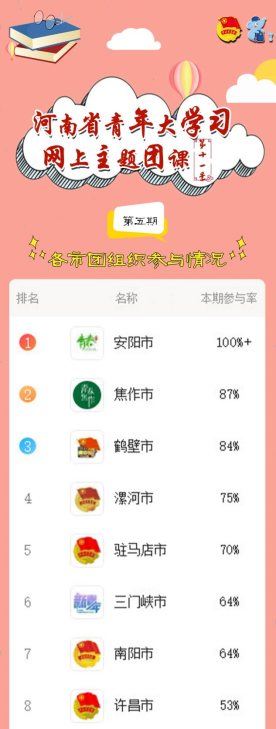 据统计,上周“青年大学习”网上主题团课中,安阳市参与率领先,焦作市位居第二,鹤壁市、漯河市、驻马店市紧随其后,周口市、商丘市上周暂时落后,继续加油。