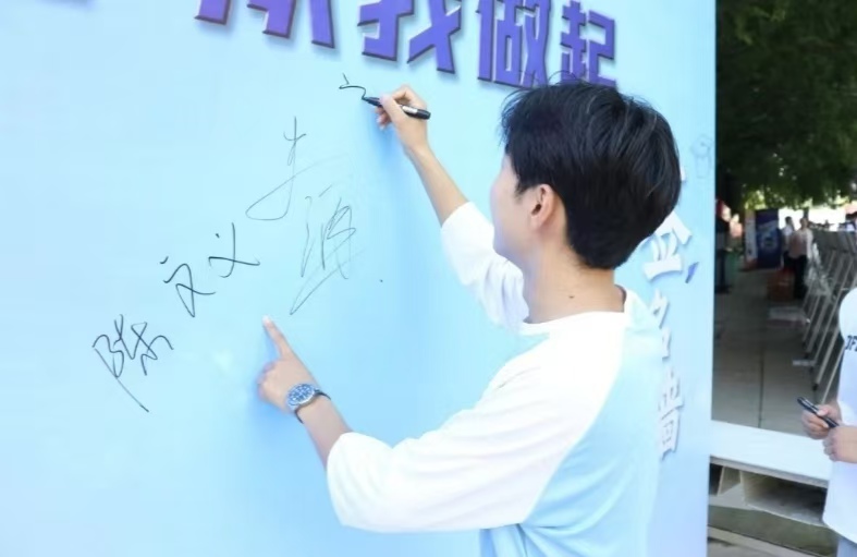 宣传现场,悬挂宣传横幅、摆放宣传展板、分发宣传折页、布放了“诚实守信从我做起”的巨幅海报,学生们纷纷在海报上签名,许下诚实守信的诺言。