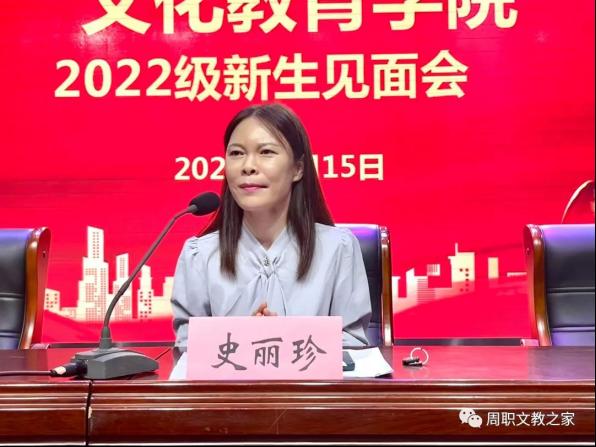 史丽珍院长首先向22级新生介绍了周口的悠久历史和风土人情。接着介绍学校发展历史和办学理念,以及文化教育学院的师资力量、实训室建设和取得的各项成绩,希望新生们了解课程设置,树立学习目标,要求大家学好专业知识。最后希望新生同学们牢记嘱托,不负韶华,在青春的赛道上奋力奔跑,争取跑出当代青年的最好成绩!