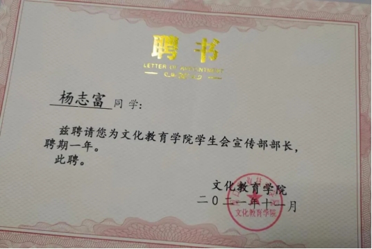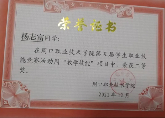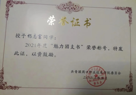 杨志富,男,周口职业技术学院,文化教育学院,20级语文教育专业7班团支书兼副班长,院团总支宣传部部长,在校期间荣获“文化教育学院优秀团员”“2021年度魅力团支书”,“文明学生”“三好学生”“周口职业技术学院20级优秀毕业生”“优秀学生干部”“国家励志奖学金”。大一时加入团总支,大二时担任宣传部部长,对党、团组织有了更深刻的认识与感悟,对团务工作也有了更加深刻的了解与认识。2021年中国共产党建党百年之际配合团总支、部长完成了征文写作比赛,并在学院和老师的指导下,参加了“中国共产党建党百年党史知识竞赛”荣获校级一等奖;在2021年周口职业技术学院第五届学生职业技能大赛师范生教学技能比赛中荣获二等奖;在周口职业技术学院第34届“世界艾滋病日”教育宣传系列活动中,积极组织各项活动,表现优异荣获最佳组织奖”,“优秀志愿者”。在2022年迎新活动中,积极奉献,积极参与,荣获“迎新先进个人”称号。2023年,考入商丘学院。