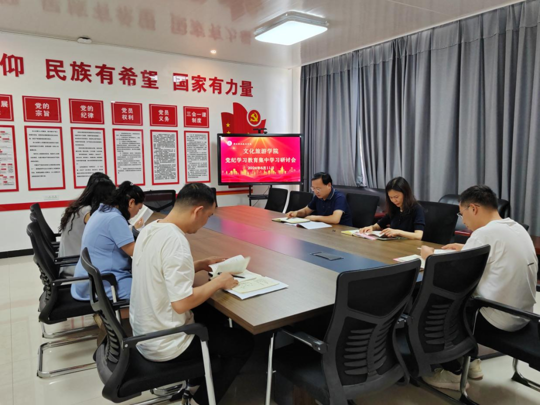 6月11日下午,文化旅游学院在五区党员活动室召开党纪学习教育集中学习研讨会。学院党总支书记展贤东、院长史丽珍、副院长于慧娟、李炯、综合办主任石永丽、教务办主任马淼、学管办主任普俊参加会议。会议由党总支书记展贤东主持。