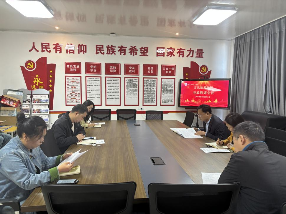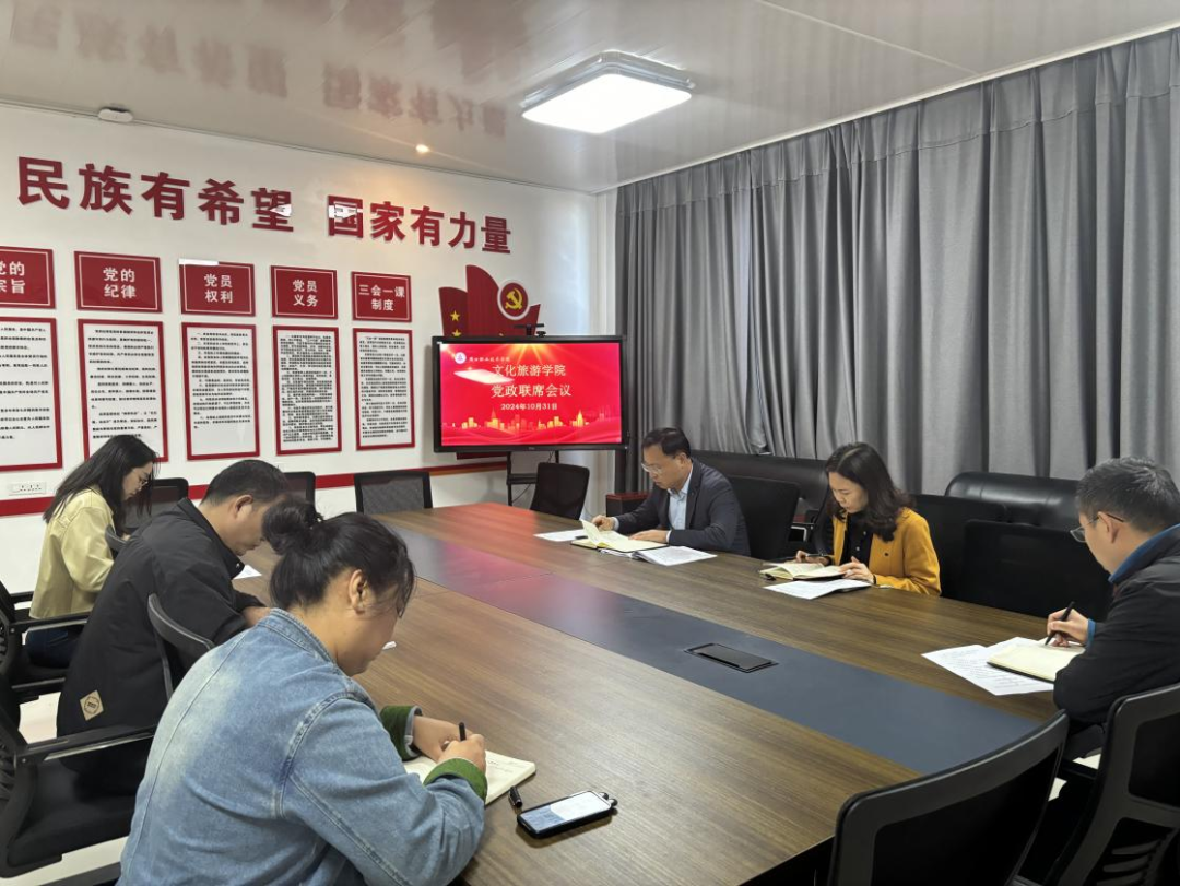 10月31日,文化旅游学院在五区党员活动室召开党政联席会议,学习贯彻李清臣校长讲话精神和学校年度综合考评方案(修订),研究部署2024年学生转专业等工作。党总之书记展贤东、院长史丽珍,副院长于慧娟、李炯,学管办主任普俊、综合办主任石永丽参加本次会议。会议由展贤东主持。