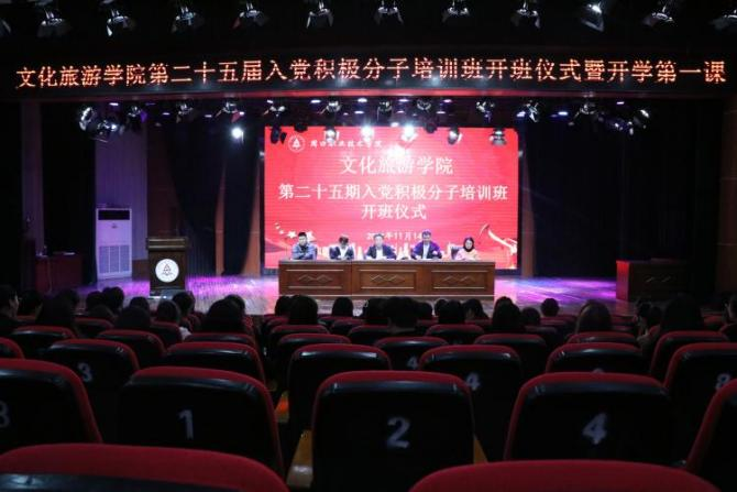 11月14日下午,文化旅游学院在砺德厅举行第二十五期入党积极分子培训班开班仪式。学院党支部书记展贤东,学生党支部书记普俊,支部宣传委员刘炎老师、纪检委员王明清老师、党员代表及全体入党积极分子参加开班仪式。仪式由普俊主持。