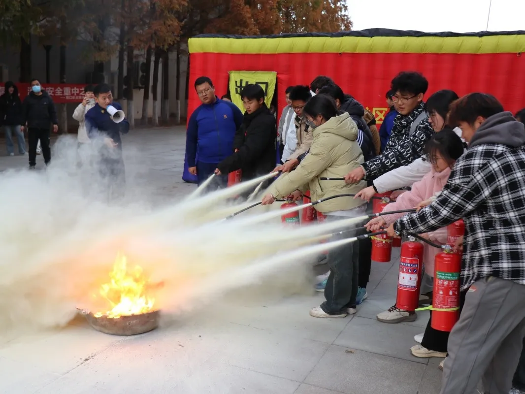 随后,周口市消防支队带领同学们正确使用消防栓,模拟灭火和疏散演练。演练过程中同学们积极参与,认真听取负责人的指导,并按照正确的步骤使用灭火器进行灭火操作。同时,在模拟火灾疏散环节,同学们也能够迅速、有序地撤离到安全区域。整个演练过程紧张而有序,达到了预期的效果。