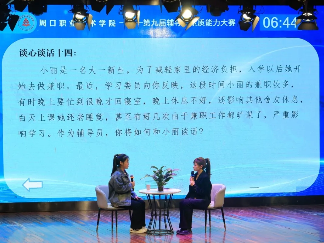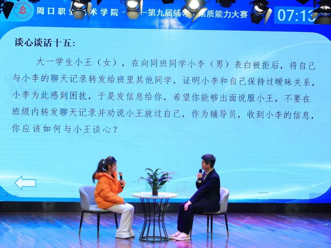 本次大赛分为三个比赛环节分别是“基础知识测试”、“案例研讨”、“谈心谈话”。比赛内容涵盖广泛,都紧扣校园生活中的事实案例,不仅考验了辅导员应对突发情况时灵活应变的处理能力,还展现了辅导员们丰厚的知识底蕴