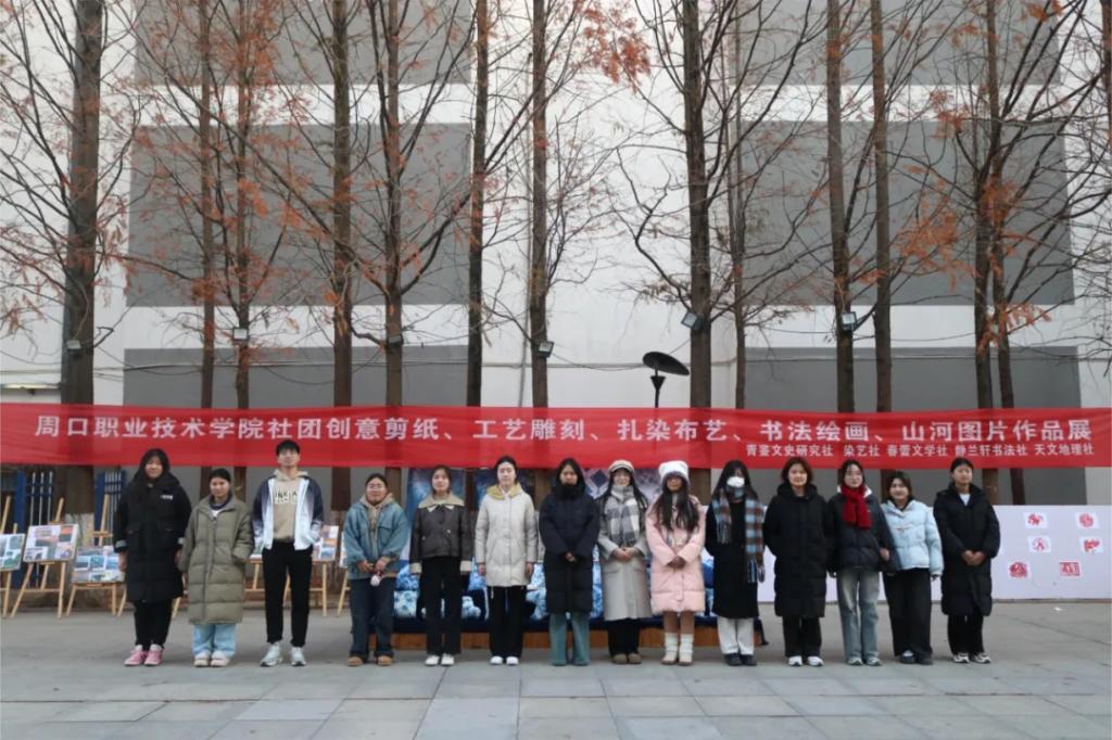2024 年 12 月 16至17 日,周口职业技术学院开元校区砺德厅楼下迎来了一场艺术的盛会。青鉴文史研究社、染艺社、春蕾文学社、静兰轩书法社、天文地理社五大社团齐聚于此,共同开展社团创意剪纸、工艺雕刻、扎染布艺、书法绘画、山河图片优秀作品展。