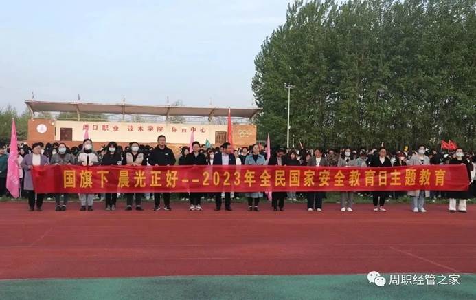 在第八个全民国家安全教育日的活动进行下,为了进一步加强我院全体师生的凝聚力,丰富我院学生精神文化内涵,引领我院广大青年学子继承和发扬光荣的爱国主义传统,进一步认识到维护国家安全、人人有责,人人可为的精神。4月10日早,周口职业技术学院经济与管理学院在操场举行升国旗仪式。党总支书记陈鹏、院长袁向华、副院长郑文娟、学管办主任赫莉娟、全体21、22级辅导员及学生参加此次升国旗仪式。会议由22级电子商务2班王莉杰主持。