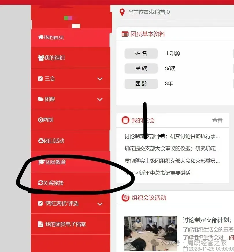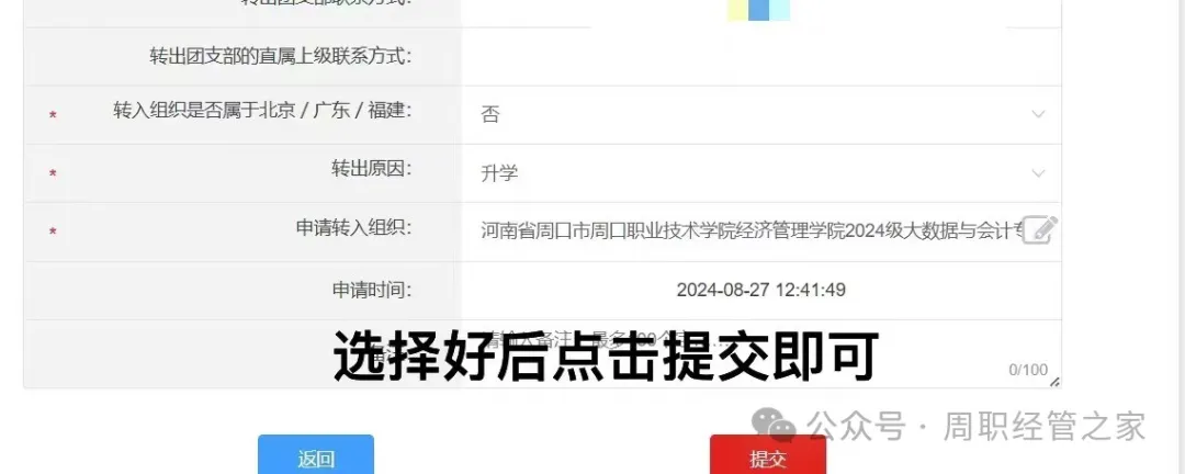 第二步:掌握学生录取学校信息后,发起转出申请,一定要选择转入周口职业技术学院“2023级具体专业团支部”,在“团员管理”栏——“组织关系转接”中,进行“办理转出”。