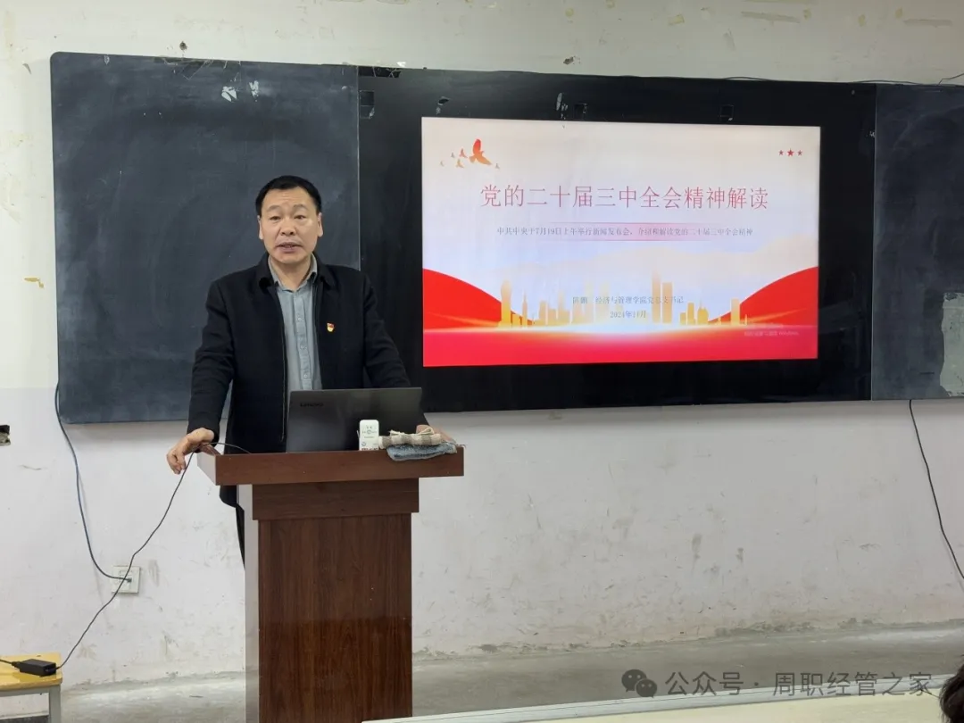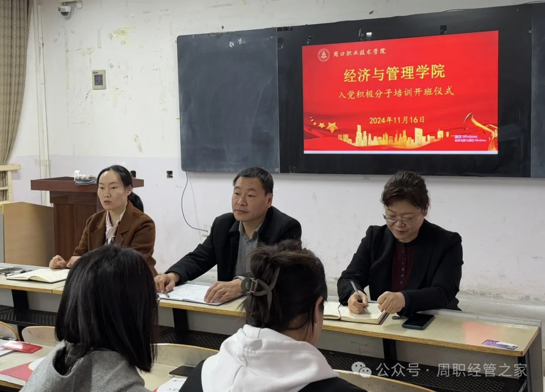 为深入学习贯彻党的二十大精神,切实做好入党积极分子的培养教育工作,提升党员发展质量,经济与管理学院于11月16号上午在4203教室举办入党积极分子培训开班仪式暨第一课。经济与管理学院党总支书记陈鹏、副院长郑文娟、学管办主任杨璐璐以及23级入党积极分子参与,仪式由学管办主任杨璐璐主持。