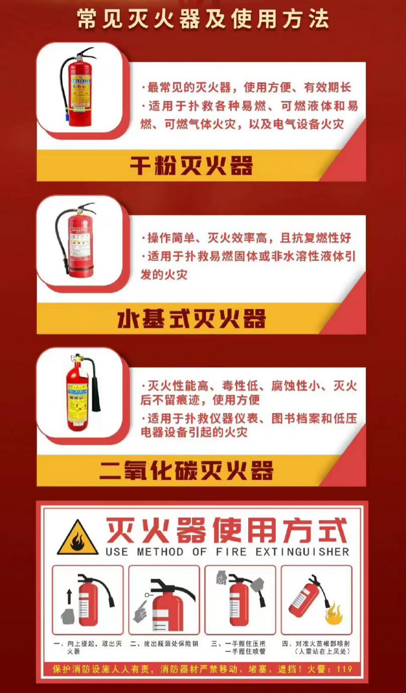 学校宿舍都设有灭火器和消防栓,这里为大家附上常见灭火器及使用方法。