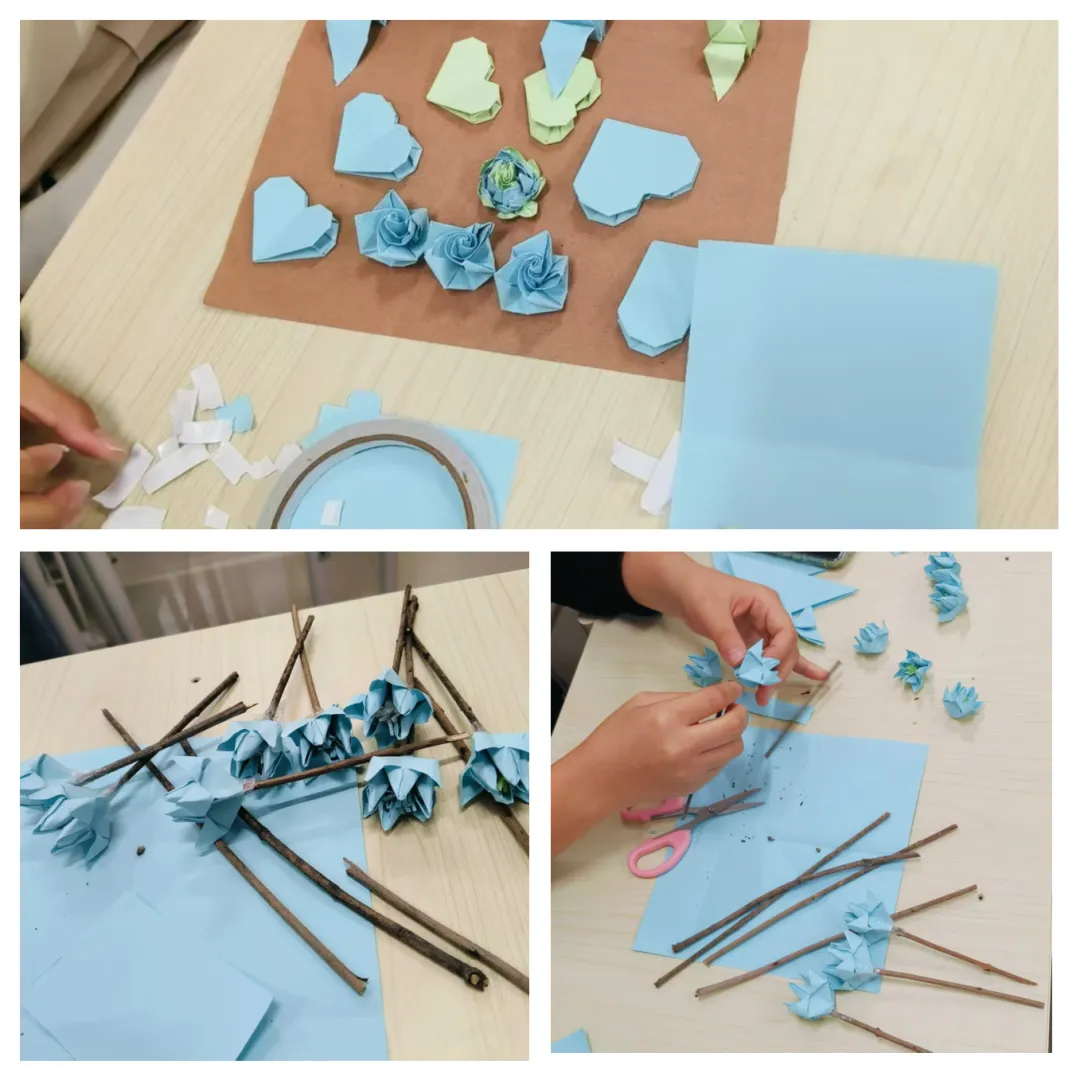 随后,同学们用巧手为纸张赋予生命,折纸作品形态各异,或为灵动的千纸鹤,或为精巧的花朵。剪纸作品更是美轮美奂,精细的图案在剪刀下诞生,展现出传统文化的魅力,也彰显出大家的无限创意。