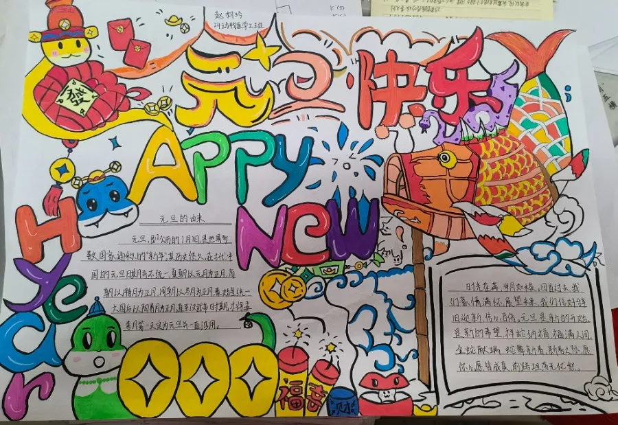 同学们充分施展自己的绘画才能,用丰富的想象力和创造力,描绘出了对新年的美好愿景。这些作品富有创意,图文并茂,文字工整,插图悦目,不仅展现了同学们的艺术天赋,也表达了他们对生活的热爱和对未来的憧憬。