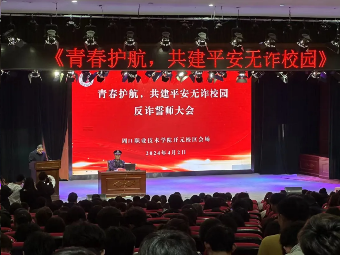 随着网络的飞速发展,电信诈骗案件频频发生,诈骗手段花样百出,令人防不胜防。为进一步提高大学生的“反诈防诈”安全意识,扩大反诈宣传覆盖面,农牧工程学院参加了周口职业技术学院开元校区特举办的“青春护航,共建平安无诈校园”的反诈誓师大会。大会由太昊路派出所警官蒋林主讲。