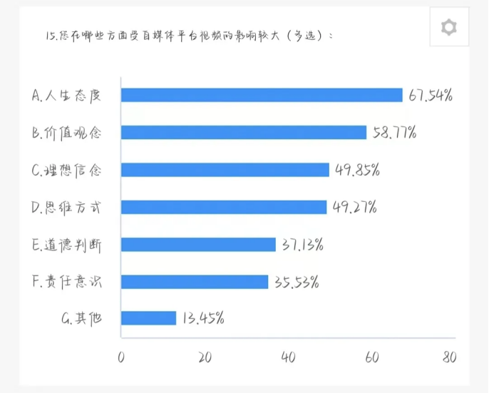 在这个问题中,被影响人生态度的学生占67.54% ;被影响价值观念的学生占58.77%;被影响理想信念的学生占 49.85% ;被影响思维方式的学生占 49.27% ;被影响道德判断的学生占 37.13% ;被影响责任意识上学生占 35.53% 。