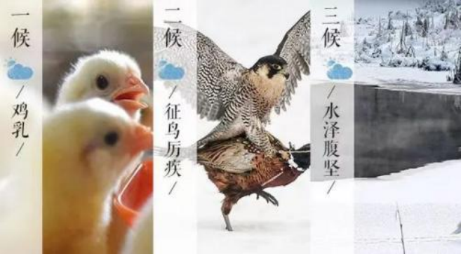 大寒:一候鸡乳;二候征鸟厉疾;三候水泽腹坚。就是说到大寒节气便可以孵小鸡了;而鹰隼之类的征鸟,却正处于捕食能力极强的状态中,盘旋于空中到处寻找食物,以补充身体的能量抵御严寒;在一年的最后五天内,水域中的冰一直冻到水中央,且最结实、最厚。
