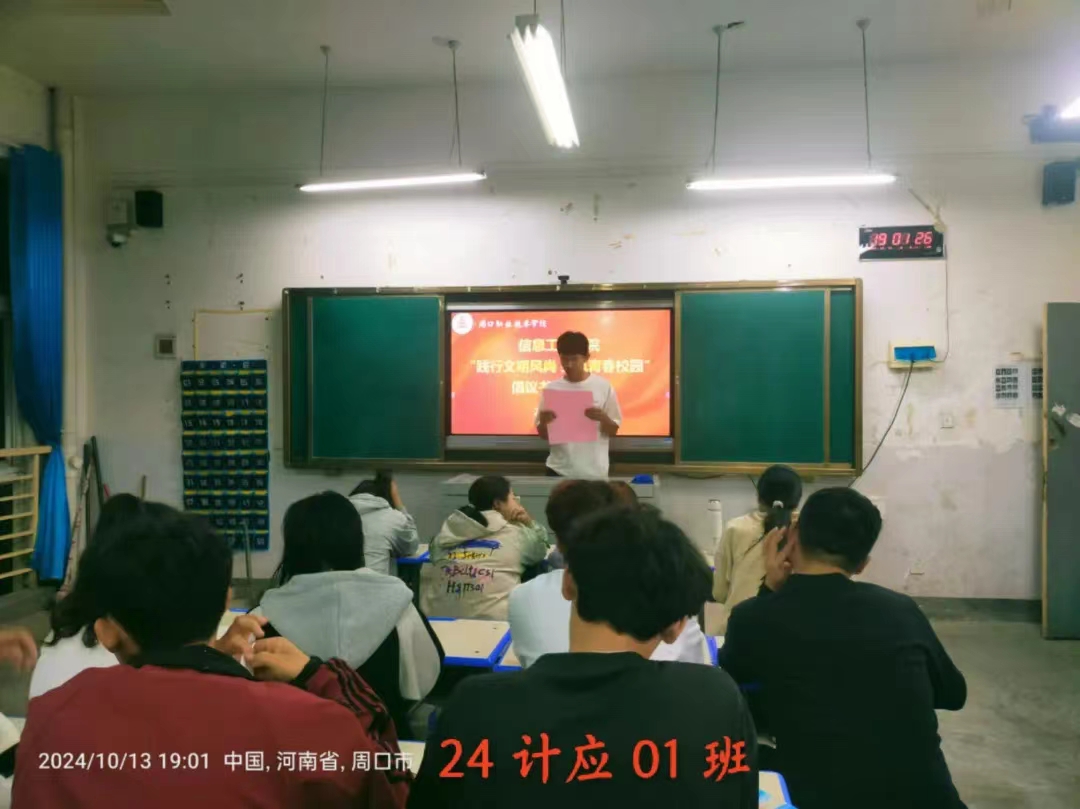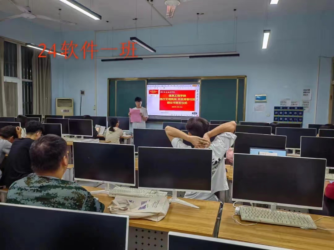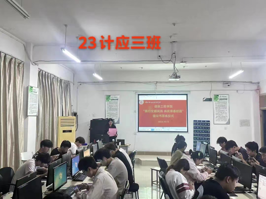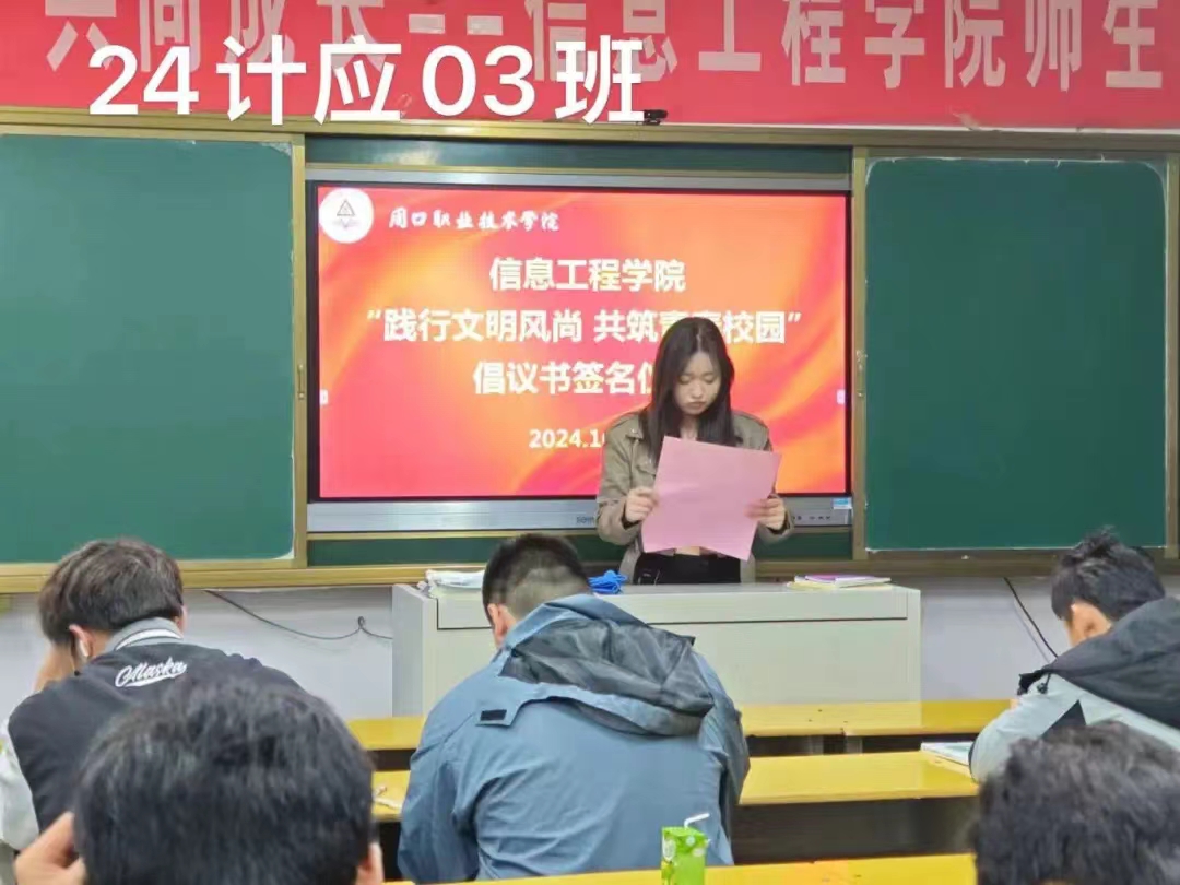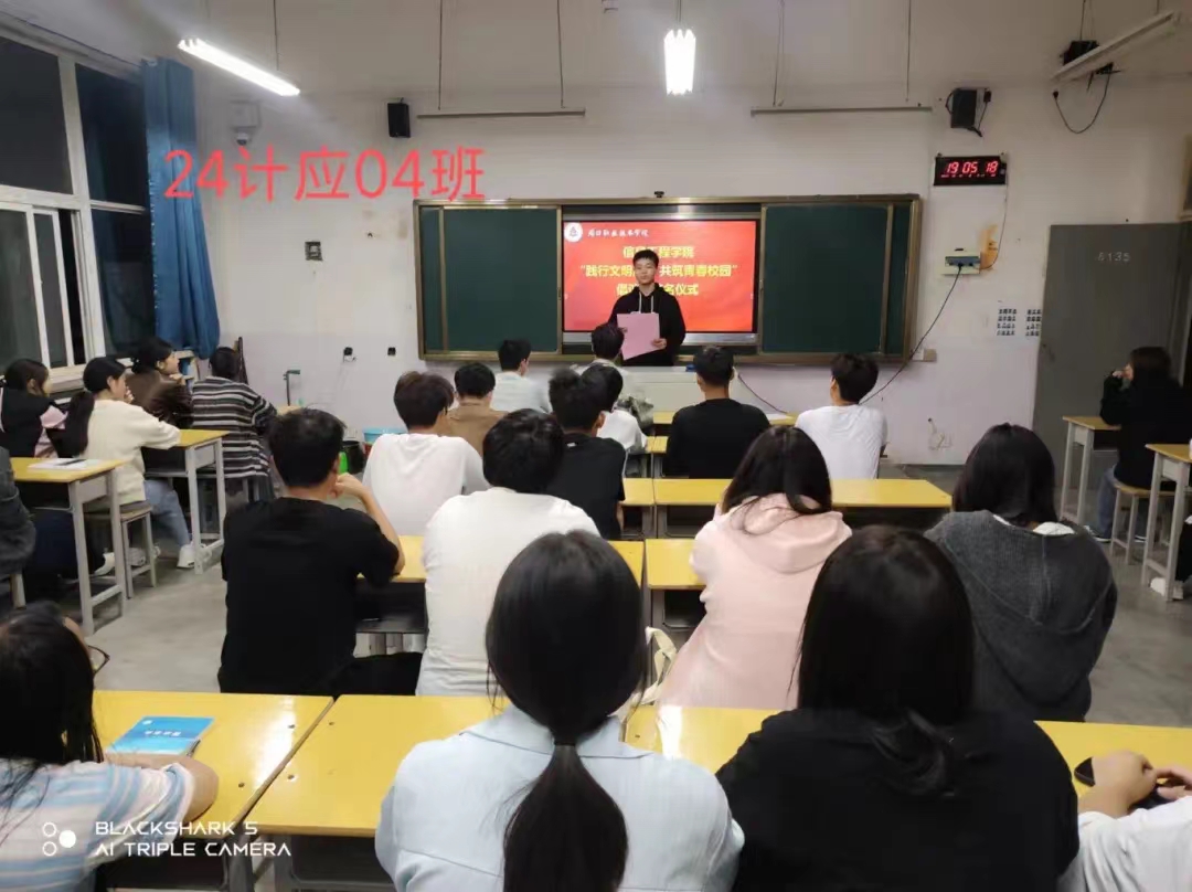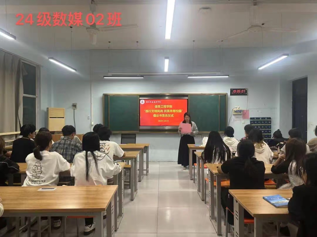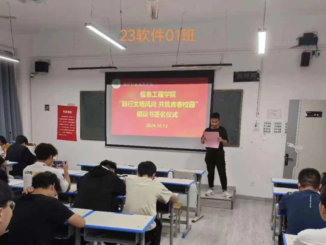 严以修身,慎独自律,为进一步促进同学们自觉践行文明礼仪,提高自身文明礼仪修养,积极营造优良育人系风、校风。10月13日,信息工程学院在各班级内举办了“践行文明风尚 共筑青春校园”倡议书签名仪式。仪式上,各班代表宣读了倡议书,号召全体同学从自身做起,从小事做起,争做文明风尚的传播者和实践者。