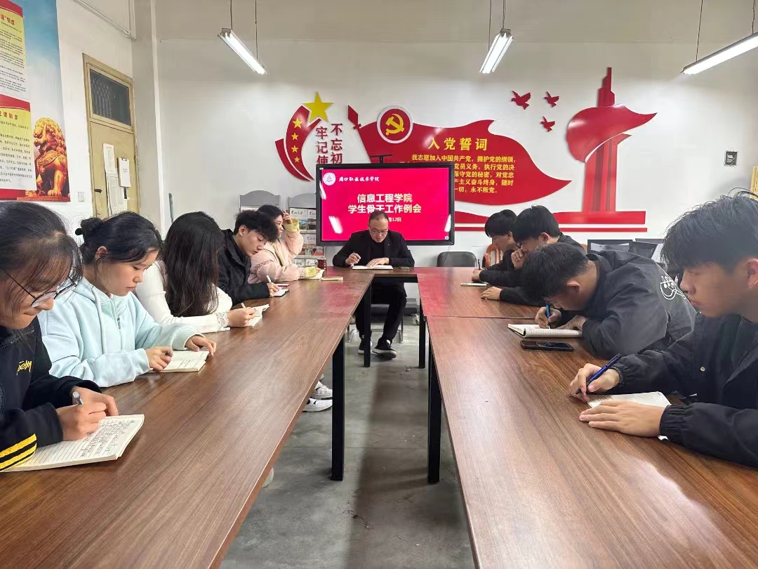 11月12日中午,在信息工程学院办公室6140,我院召开了学生骨干例会。副院长楚书来、团总支学生会主席李金鹏、团总支学生副书记王佳硕及23级团总支学生会的17名学生骨干参加了会议,会议由院长楚书来主持。