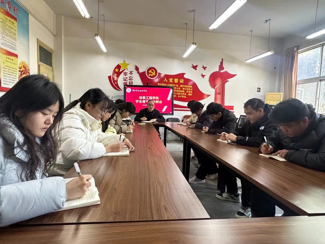 为了促进我院学生组织的建设,增强团队活力,明确未来的工作方向,并进一步提升学生骨干的综合能力和工作水平。信息工程学院于11月28号中午在办公室6140内召开了学生骨干工作例会。副院长楚书来、团总支学生会主席李金鹏、团总支学生副书记王佳硕、23、24级团总支学生会的41名学生骨干参加了此次会议,会议由院长楚书来主持。