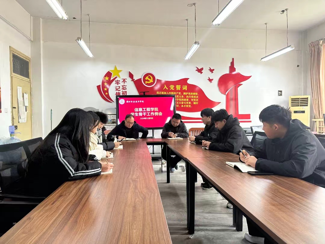 为了促进我院学生组织的建设,增强团队活力,明确未来的工作方向,并进一步提升学生骨干的综合能力和工作水平。信息工程学院于12月9号中午在办公室6140内召开了学生骨干工作例会。副院长楚书来、学管办主任张矿伟、团总支学生会主席李金鹏、团总支学生副书记王佳硕、23级团总支学生会的7名学生骨干参加了此次会议,会议由院长楚书来主持。