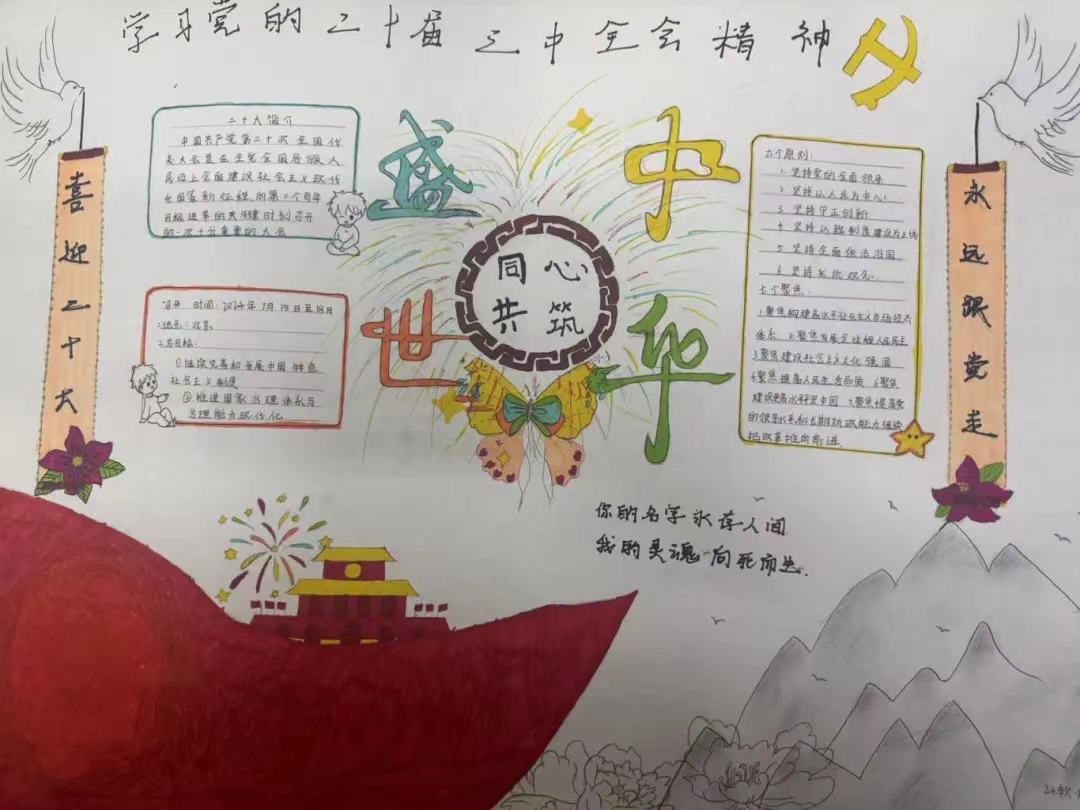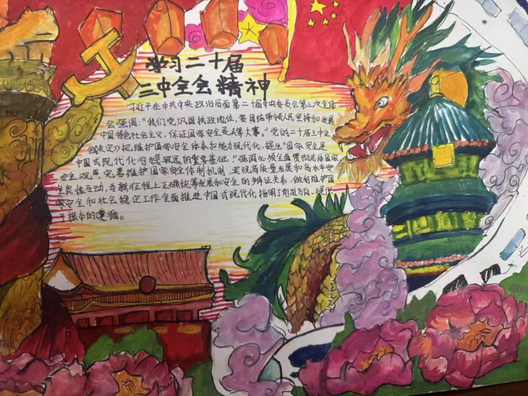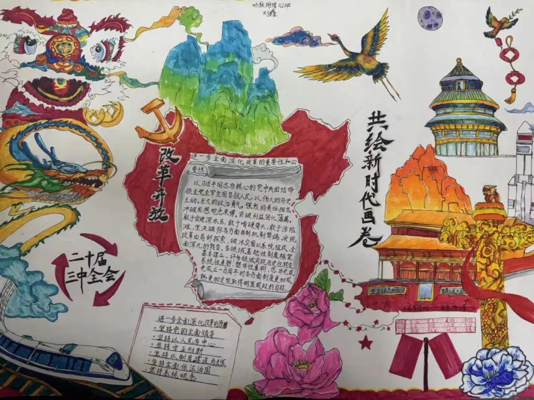 此次活动不仅是艺术与实践深度融合的体现,更搭建了一个学习和贯彻党的二十届三中全会精神的重要平台。借助手抄报这一形式,同学们将自己的理解与对国家未来的美好憧憬,转化成了一幅幅充满创意与深度的作品。通过参与此次活动,同学们不仅深化了对党的二十届三中全会精神的理解和认同,也增强了他们的历史使命感和社会责任感,从而绽放出青春的无限力量与活力。