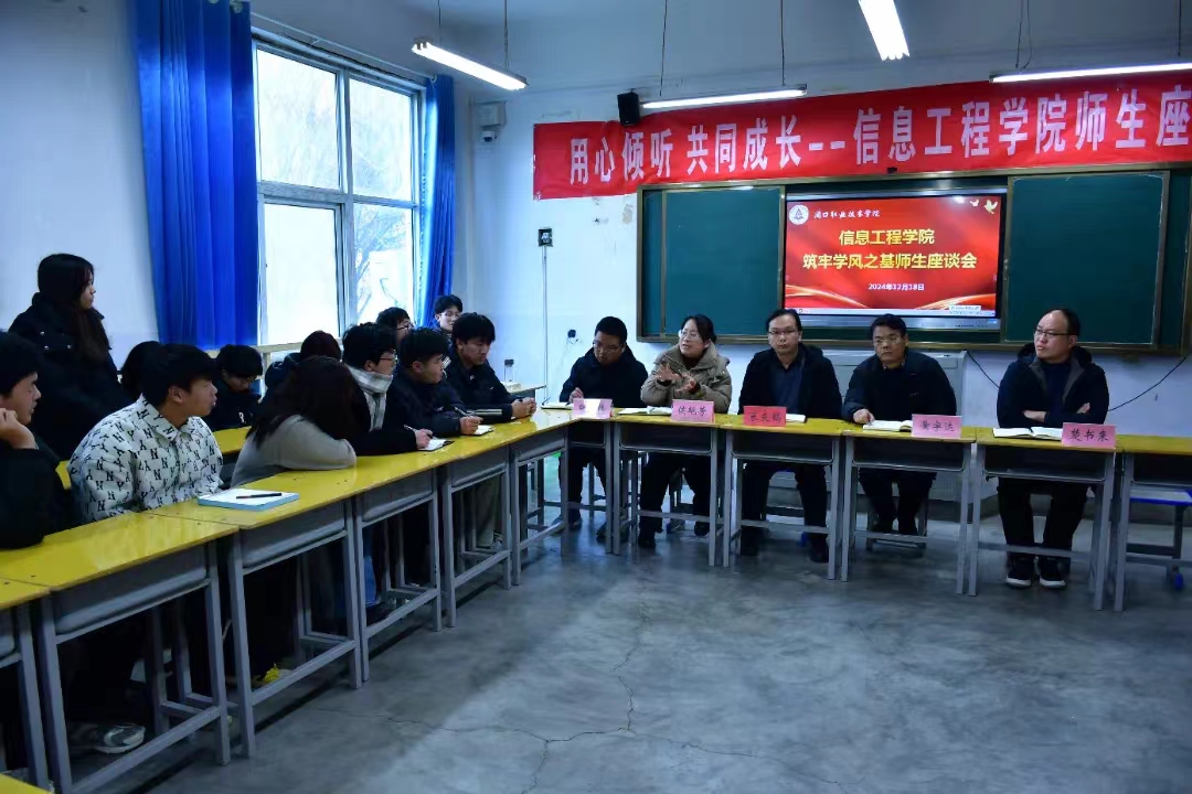 为促进优良学风建设,弘扬积极向上的学习氛围,优化育人环境,并助力学生成长成才,信息工程学院于12月18日中午在6135教室举办了“筑牢学风之基“师生座谈会。此次座谈会参加的人员包括党总支书记宋良鹤、院长黄宇达、副院长楚书来,副院长侯艳芳、学管办主任张矿伟,以及23级和24级各班级的学生代表。