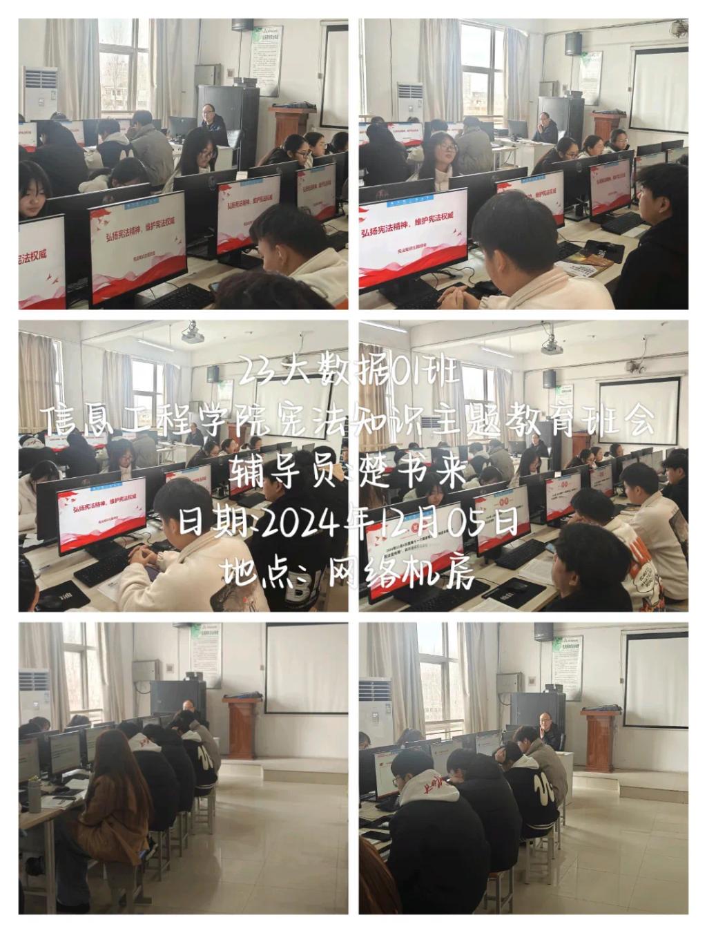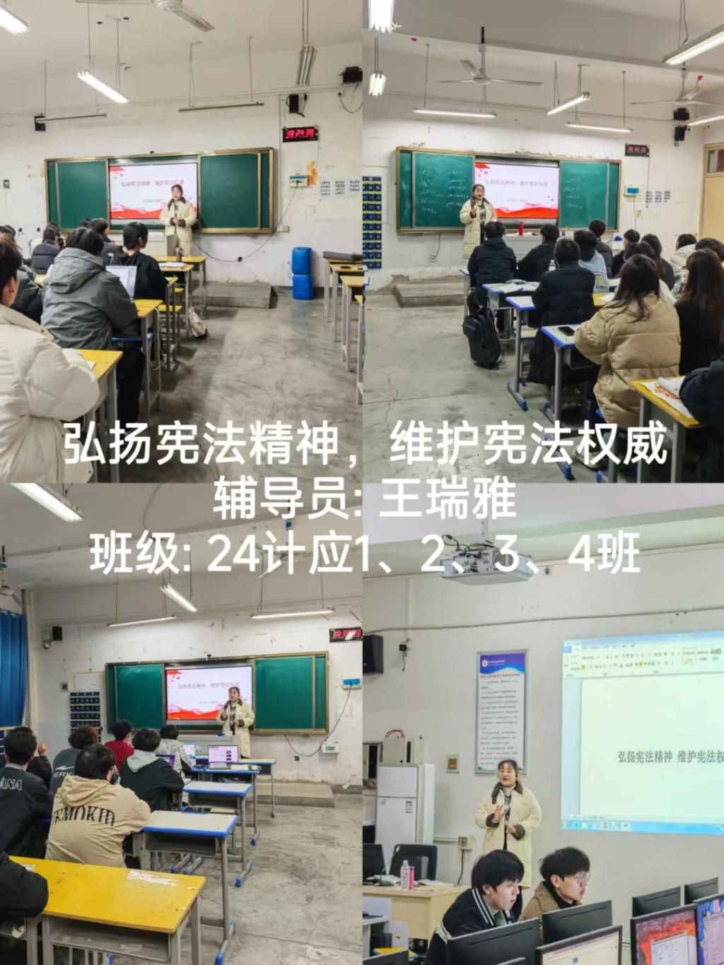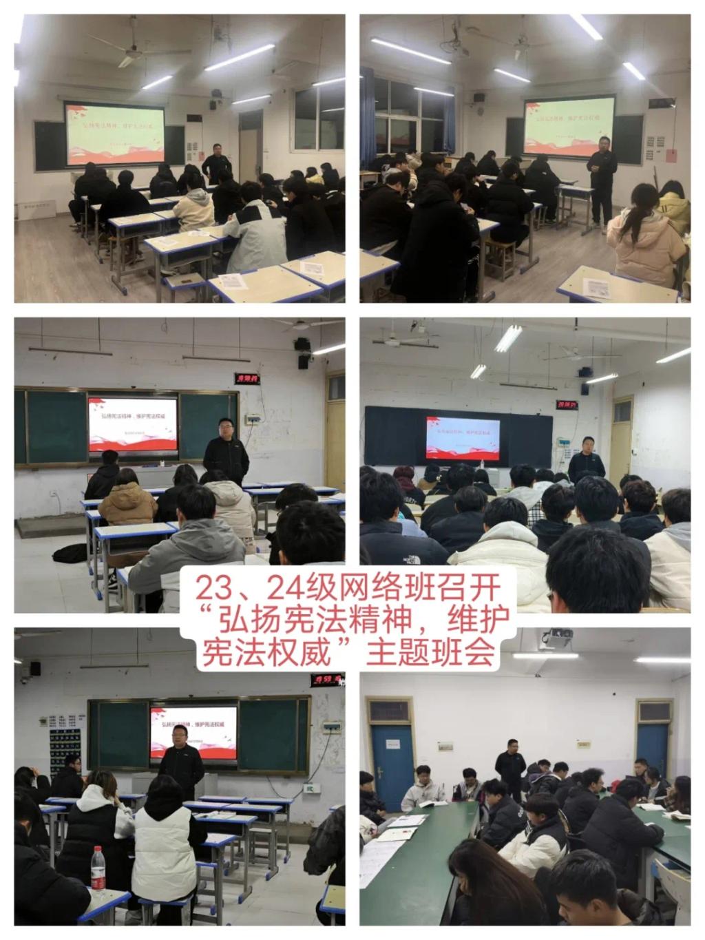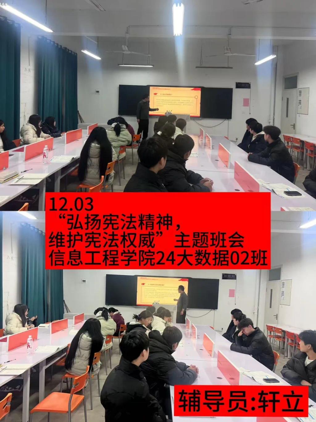 在开展班会中,各个班级的辅导员带领同学们共同学习了宪法知识,深入了解宪法的历史、基本原则以及公民的基本权利和义务等内容。通过生动的案例和通俗易懂的讲解,让同学们对宪法有了更加直观和深刻的理解。随后,还特别强调了宪法在日常生活中的作用和意义,引导同学们认识到宪法不仅是国家的根本大法,更是保护公民权利的重要法律武器。整场班会让同学们深刻体会到宪法就在我们身边,它是社会稳定和谐的基础,也是每个人幸福生活的守护者。