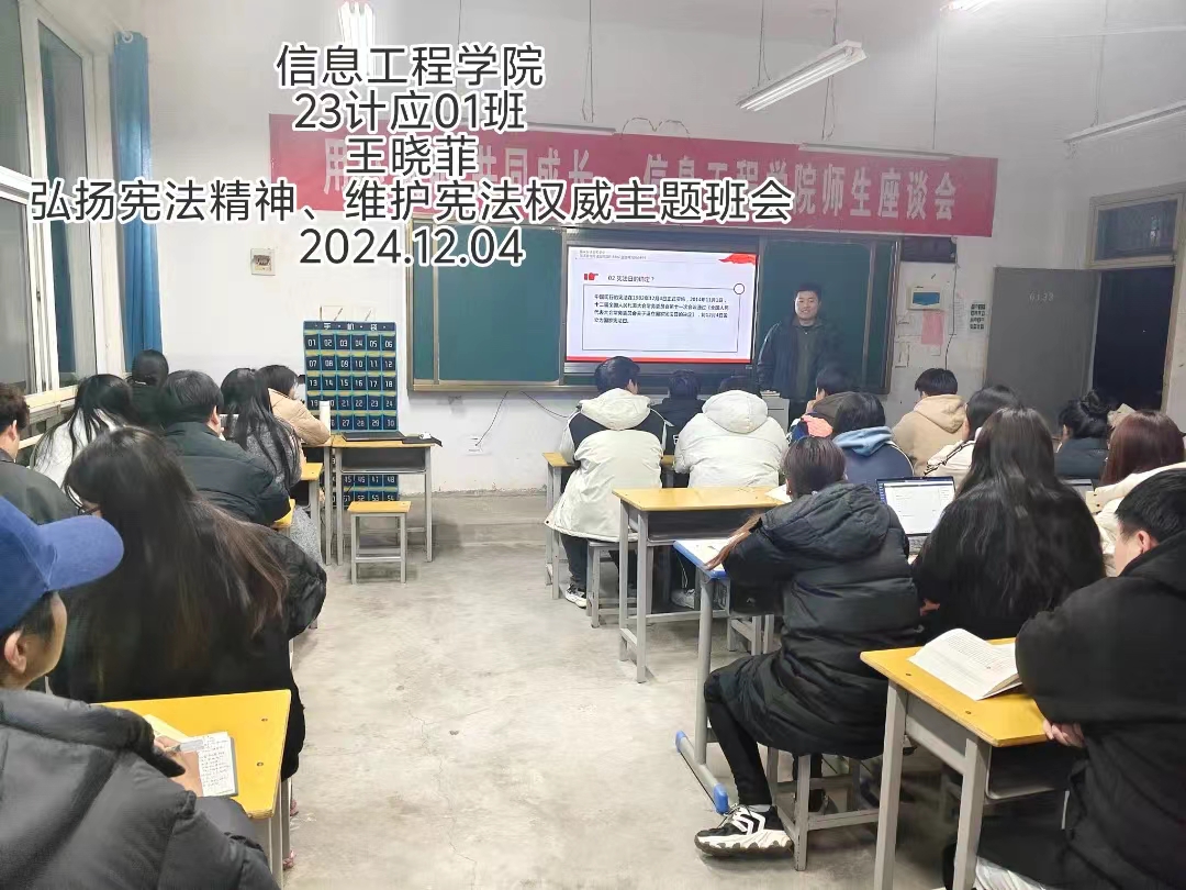 宪法作为国家的根本大法,宛如一座灯塔,指引着国家前行的方向。宪法精神体现了公平、正义与法治的核心价值,构成了社会和谐稳定的基础。为了增强同学们的法治观念,并在校内营造尊法学法、守法用法的良好氛围,信息工程学院于12月5日开展“弘扬宪法精神,维护宪法权威”主题班会。