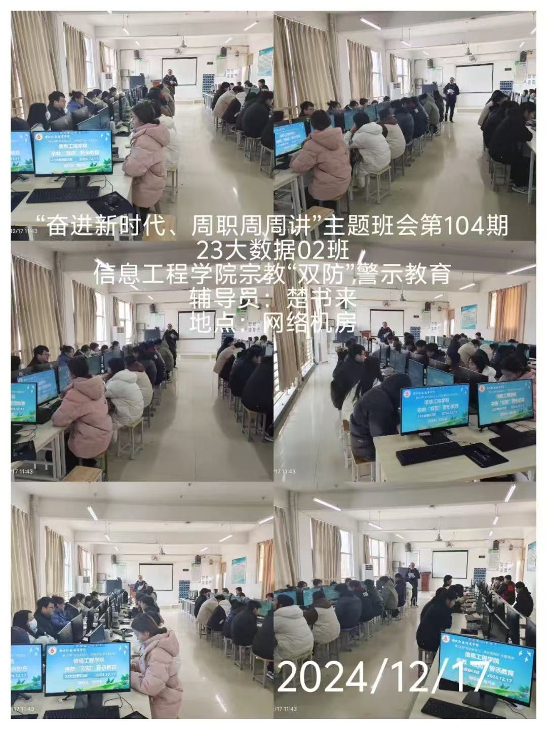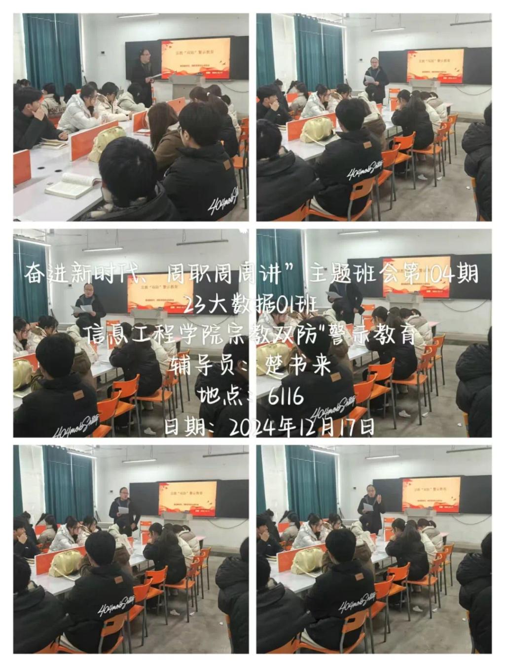 为了帮助同学们充分认识到非法宗教活动的危害,防范和抵御非法宗教势力向校园渗透,全面正确贯彻落实党的宗教政策,引导青年学生自觉抵制宗教渗透及传播。信息工程学院开展“奋进新时代,周职周周讲”第六十九期----民族宗教政策法规宣传教育主题班会。