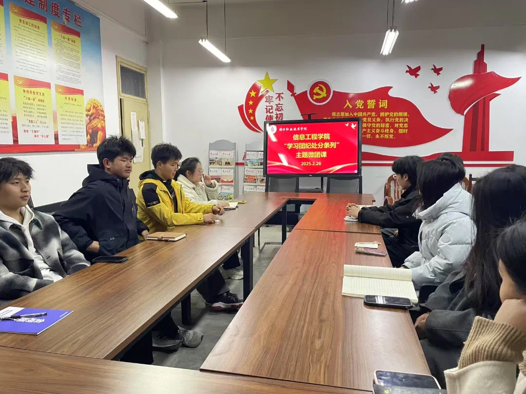 为深入学习贯彻党的二十大和二十届二中、三中全会精神,全面落实习近平总书记关于青年工作的重要思想,信息工程学院于2月26日在6140教室成功举办了“学习团纪处分条例”主题微团课活动。此次活动旨在进一步铸牢中华民族共同体意识,充分发挥共青团组织的实践育人优势,强化对青年的政治引领和价值引领,增强基层团组织的活力,做好广大团员青年的思想引领工作。