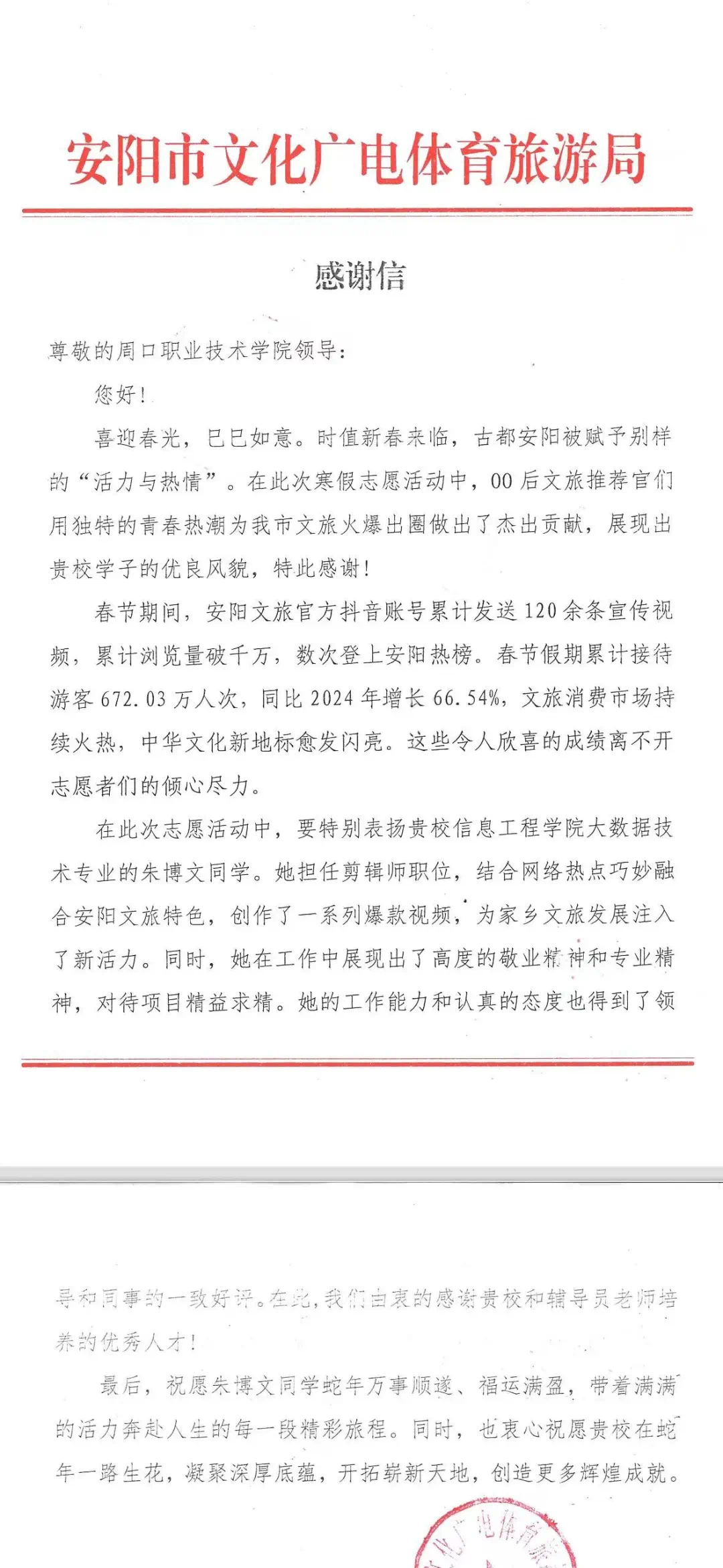 近日,我院信息工程学院收到来自安阳市文化广电体育旅游局(以下简称“安阳文旅”)的感谢信,信中对我院23大数据技术一班的朱博文同学在推动当地文化旅游事业发展中所作的突出贡献给予了高度赞扬和诚挚感谢。对此,信息工程学院全体师生深感荣幸,并对安阳文旅的认可与鼓励表示衷心感谢。