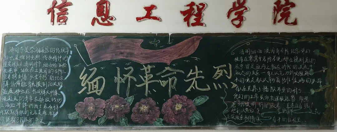 清明节,这一中华民族重要的传统节日,承载着人们对先烈的缅怀与对祖先的祭奠之情。为纪念革命先烈,传承红色基因,信息工程学院在清明节来临之际精心组织了以“清明节缅怀革命先烈”为主题的黑板报创作活动。此次活动旨在引导师生共同铭记历史、感恩先辈,并积极倡导文明祭扫的新风尚,让传统文化在新时代焕发出新的光彩。