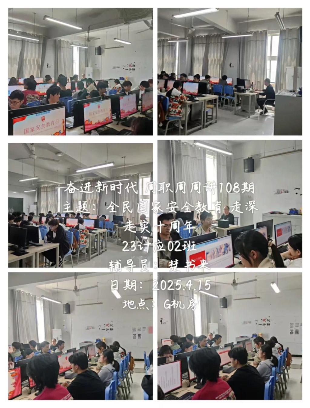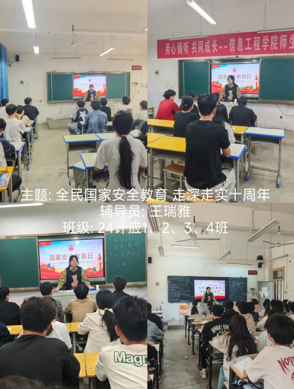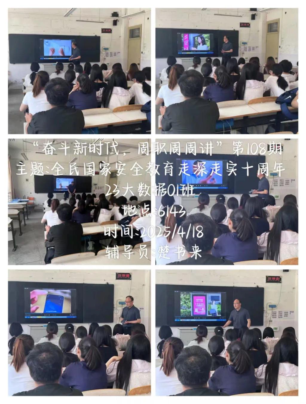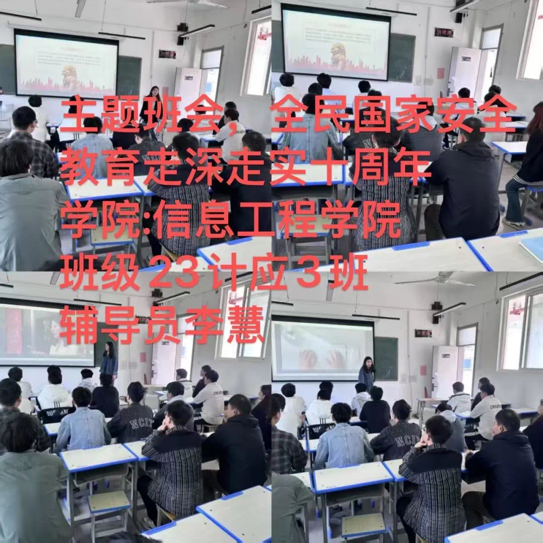 为深入学习贯彻落实总体国家安全观,增强师生的国家安全意识。信息工程学院于4月中旬在各个班级开展“奋进新时代、周职周周讲”主题班会第108期“全民国家安全教育,走深走实十周年”主题班会。此次班会旨在深入学习贯彻总体国家安全观,增强同学们的国家安全意识,培养他们的责任感和使命感。