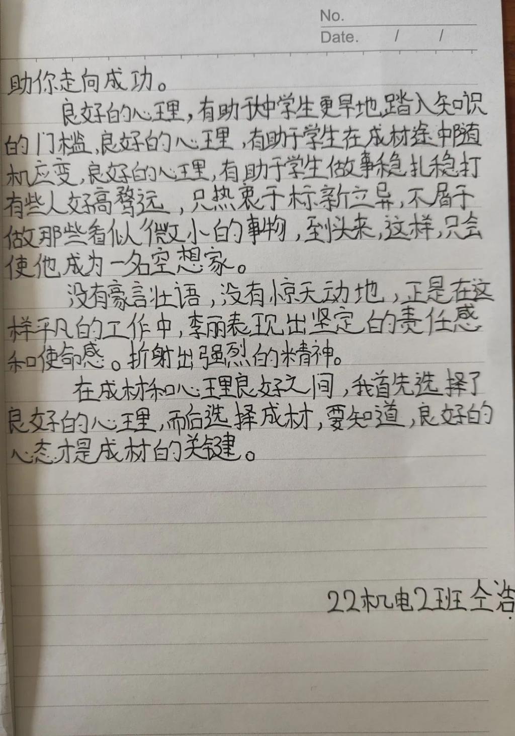 为鼓励和引导同学阳光成长,促进当代大学生树立正确的价值观、人生观。2023年5月11日,汽车与机电工程学院举行“拥抱阳光,润心前行”心理健康征文活动。各班学生积极参与投稿。