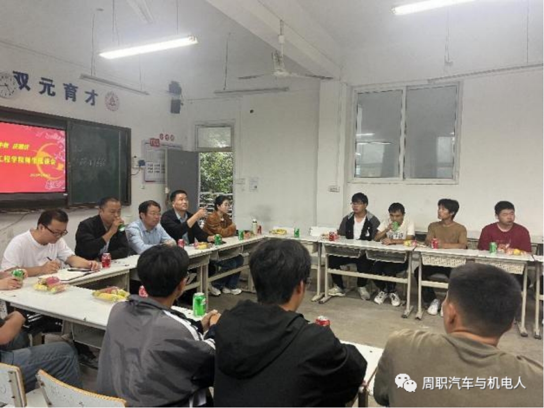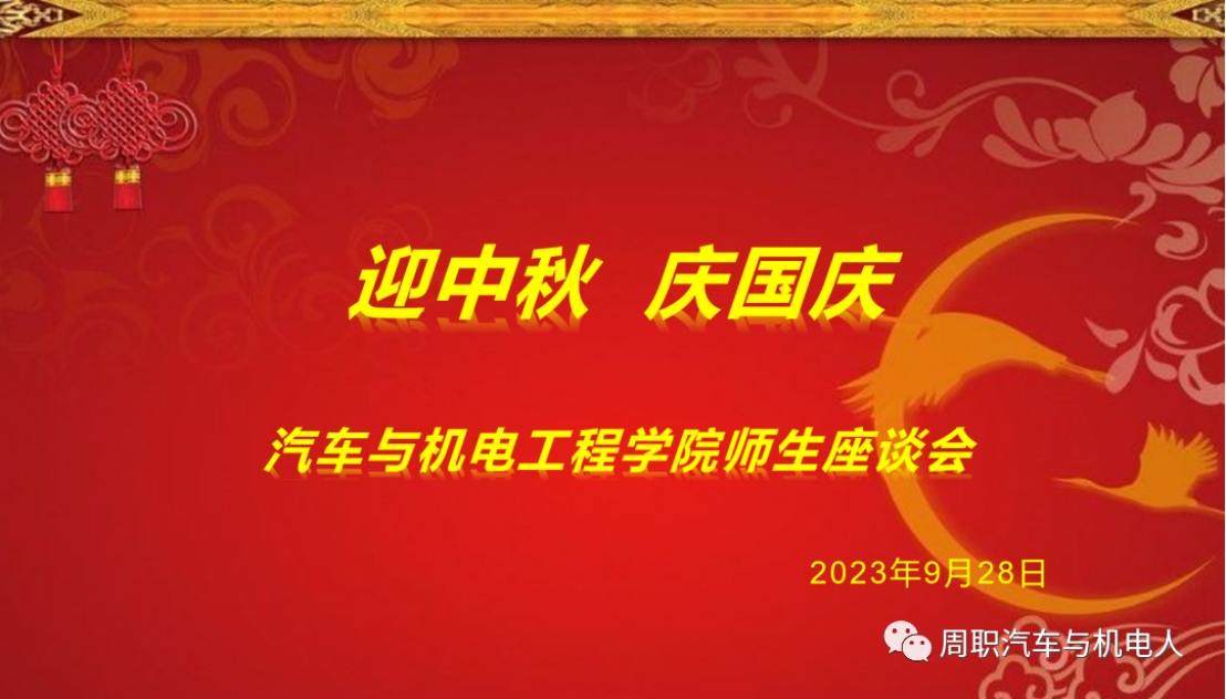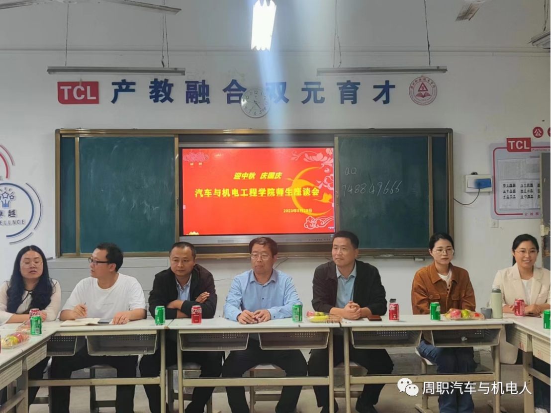 金秋九月,丹桂飘香。在中秋、国庆“双节”来临之际,2023年9月28日下午,周口职业技术学院汽车与机电工程学院开展“迎中秋·庆国庆”师生座谈会。党总支书记崔东风,副院长王文立、田伟华,学生管理办公室主任王亮,综合办公室主任、23级辅导员雷艳华,教学管理办公室主任、23级辅导员丁兰花,教师代表苏大体,23级留校学生代表,22级学生干部代表等参加座谈会。