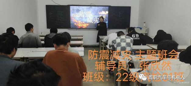 地震对人类的生命和财产造成很大的威胁。为了进一步宣传普及防灾减灾知识,提升同学们应对地震灾害风险防范意识和能力,保障自身安全。周口职业技术学院汽车与机电工程学院于2023年10月27日晚上各班级开展“防震减灾,珍爱生命”主题班会,进行与地震相关的学习和讨论。