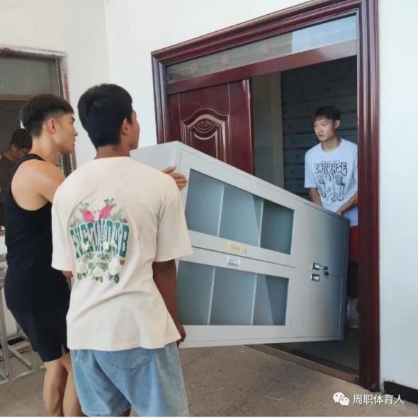 在整理过程中,21级体育教育二班c组的学生们搬、抬、扛齐上阵,虽然天气炎热,工作量巨大,大家并没有喊累,而是互相加油,默契配合。