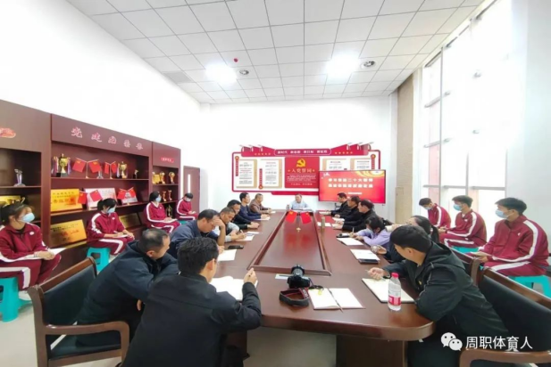 11月2日下午,周口职业技术学院党委委员、副校长李明臣以“学习党的二十大精神,推进体院高质量发展”为题,为体育学院全体党员教师和学生代表讲授了一节生动的党课。