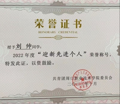周口职业技术学院体育学院2021级体育教育1班学生,三年制专科。担任校学生会副主席、体育学院学生会主席一职,成绩优异,表现突出。先后荣获:2022–2023学年度国家励志奖学金、河南省“优秀学生干部”、周口职业技术学院“优秀共青团干部”、周口职业技术学院优秀运动员、周口职业技术学院“文明学生”等一系列荣誉称号。