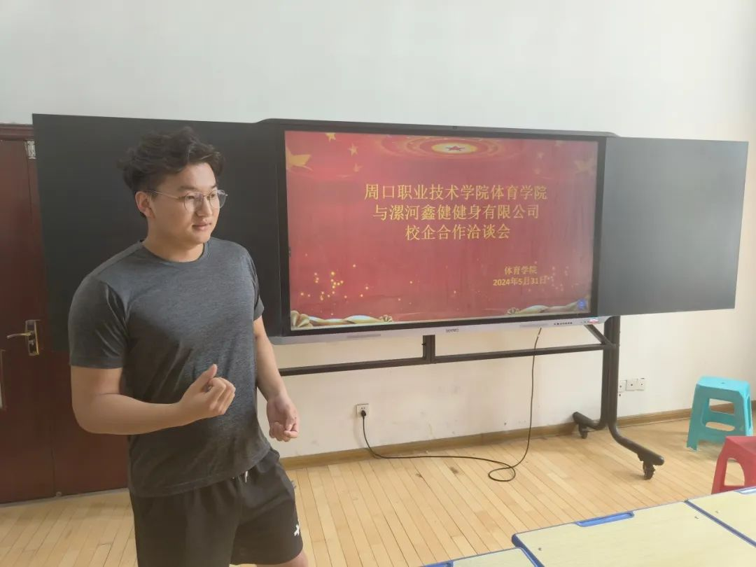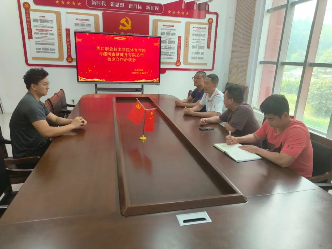 为进一步加强与双汇之间的校企合作,推动产学研协同创新,寻求校企合作共赢、共谋发展的良好局面,漯河鑫健健身有限公司校企与周口职业技术学院体育学院进行合作洽谈会,本次会议有李院长,范书记,王保泰老师,王帅老师以及鑫健健身有限公司负责人参加。