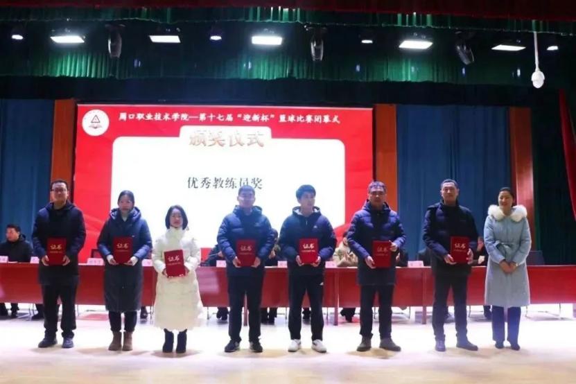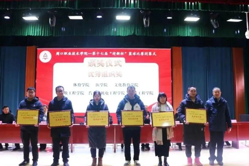 2023年12月21日下午4:00,周口职业技术学院第十七届“迎新杯”篮球赛闭幕颁奖仪式在体育馆举行。医学院党总支书记苑建伟、学管副院长王向华、团总支书记聂蕾及获奖运动员参加此次活动。我院荣获本次比赛优秀组织奖,优秀教练员奖、乙组女子亚军。