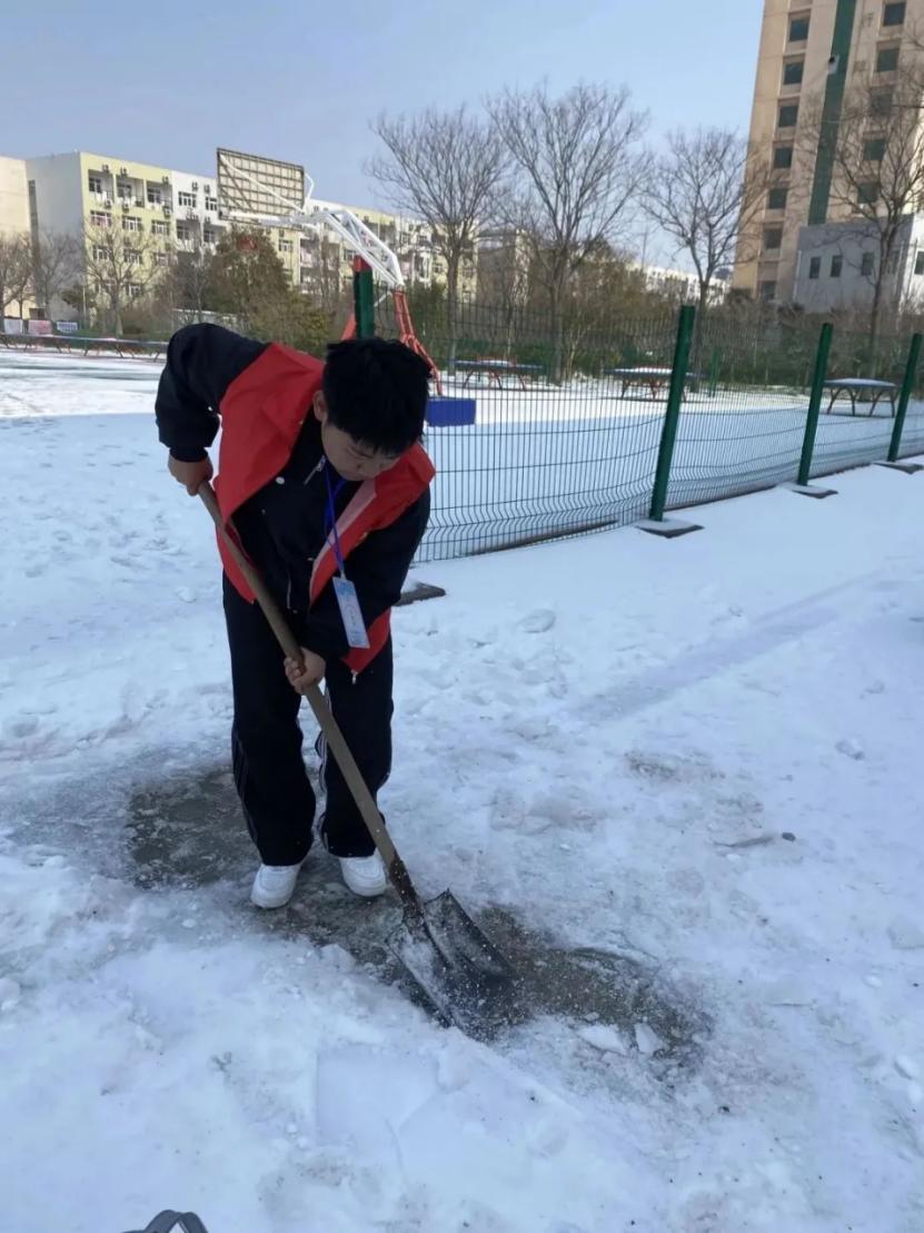 为使校园道路更加畅通,自律委员会成员自发到教学楼清理台阶积雪,虽然道路上的积雪已被压实,清扫工作变得异常具有挑战性,但是志愿者们毫不畏寒,手握铁锹和铁铲,相互协作,齐心协力,只为将校园道路上的积雪和冰块尽快清除,让师生们可以安全畅通地出行,志愿者们用实际行动展示出团结协作的力量,展现青春的活力和担当的精神。