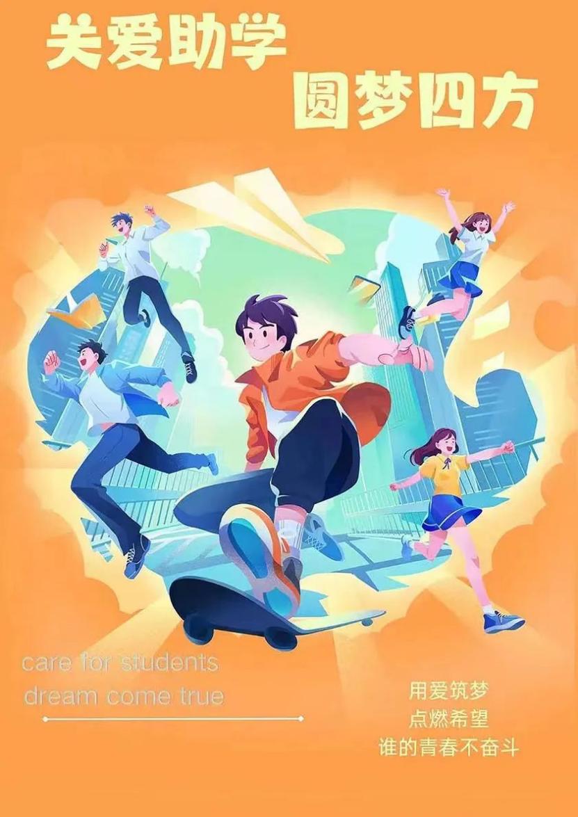 创作说明:本设计方案围绕“关爱助学,圆梦四方”这一主题进行相关元素创作,画面中的人是指所有心怀梦想的学子,整体构架呼吁大家关注助学,给更多的孩子一个上学的机会。用爱筑梦,点燃希望,谁的青春不奋斗!