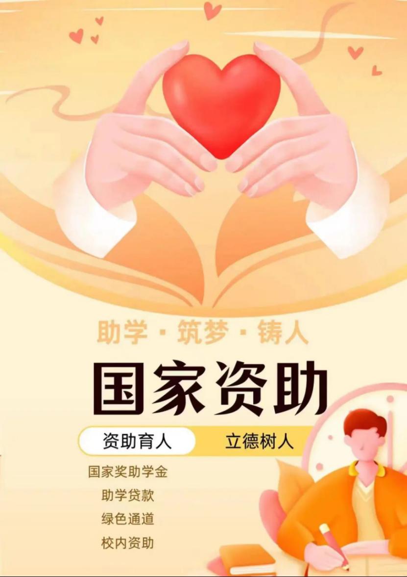 三、意义内涵:整体采用暖色调当作背景,用双手怀着爱心表达着党和国家的政策辅佐着学子完成自己的人生理想。用朴实无华的线条映衬着海报主题,其中上方背景有六个小爱心做点缀,表达着不止有国家的政策帮助学子完成梦想,还有许许多多的年轻人给予的帮助以及社会给予的帮助。大爱心的下方用简单线条作为背景,线条的弧度与爱心的弧度相映衬并且构成对比。紧接着下方就是海报的主题“助学、筑梦、铸人”。点题国家资助,简单的文字表达资助的各种类型,直接表达资助的种类繁多,文字的右方是学子的奋发图强、努力学习的样子,表达了在国家的资助下,学子们努力学习实现人生价值的样子。其中上方双手与爱心与“资助育人”相互呼应,右方的学子努力学习与“立德树人”相照应,形成了两处对比,又一次的点名主题,突出国家资助对学子的重要性以及资助的各方面的优点,强调主题。