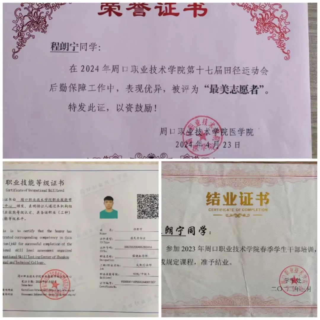 程朗宁,22级医学影像技术专业学生,现任医学院学生自律委员会部长。他刻苦学习,乐于思考,综合测评成绩在班内居于前列,获得河南省“三好学生”,校“文明学生”称号。积极参与学校举办的各项活动,如羽毛球比赛,拔河比赛,并因在学院迎新活动中帮助同学和运动会中服务同学获“优秀志愿者”,他的这些经历不仅丰富了他在校内的生活,同时也加强了他的责任感和服务精神。