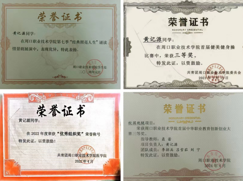 黄记源,22级康复治疗技术专业学生,现任周口职业技术学院医学院团总支宣传部部长。曾荣获国家励志奖学金、省级三好学生、院级“优秀青年志愿者”“优秀组织奖”他作为一名学生骨干他平时热心帮助学院同学,积极组织、宣传和参加公益活动,品学兼优,严格遵守学院的各项规章制度,做好模范带头作用,8余项荣誉。曾参加周口职业技术学院第五届读书分享会知识竞答荣获“三等奖”;获第七季经典照亮人生诵读情景剧展“优秀演员奖”; 获校健美健身操比赛“三等奖”;获院“传承雷锋精神,践行时代担当”活动“先进个人奖